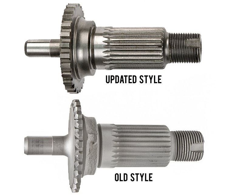 These later style shafts are a drop-in replacement for 1986-1993 transfer cases. You can see the difference in the picture above - the older version is on top and the updated version is shown below it. This upgrade is especially good for transfer cases that have lower-than-stock gearing in them because the lower the gear, the higher the torque load going through the gear.